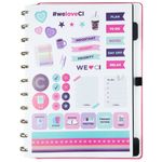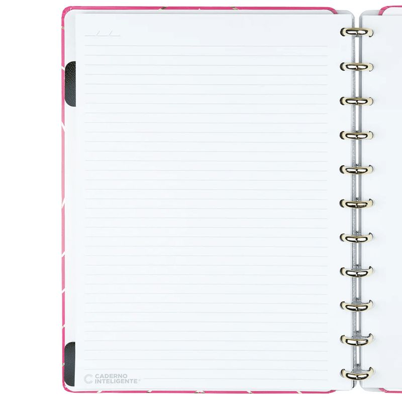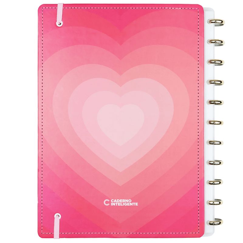 Apaixone-se e inspire-se com este caderno que vai completar o seu mundo rosa com um glow super sofisticado em formato de coração com hot stamping dourado. Capa e contracapa rígidas, 01 folha de adesivos, 01 bolsa plástica, 01 folha de instrução de uso e manuseio, com refis e acessórios da marca disponíveis no verso, 01 folha de identificação com calendário no verso, 04 divisórias com abas para identificação (02 pretas e 02 transparentes), 80 folhas offset 90g (60 folhas pautadas e 20 folhas lisas brancas para impressão), 01 suporte com elástico para 01 caneta ou 01 lápis e discos M + elástico.