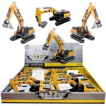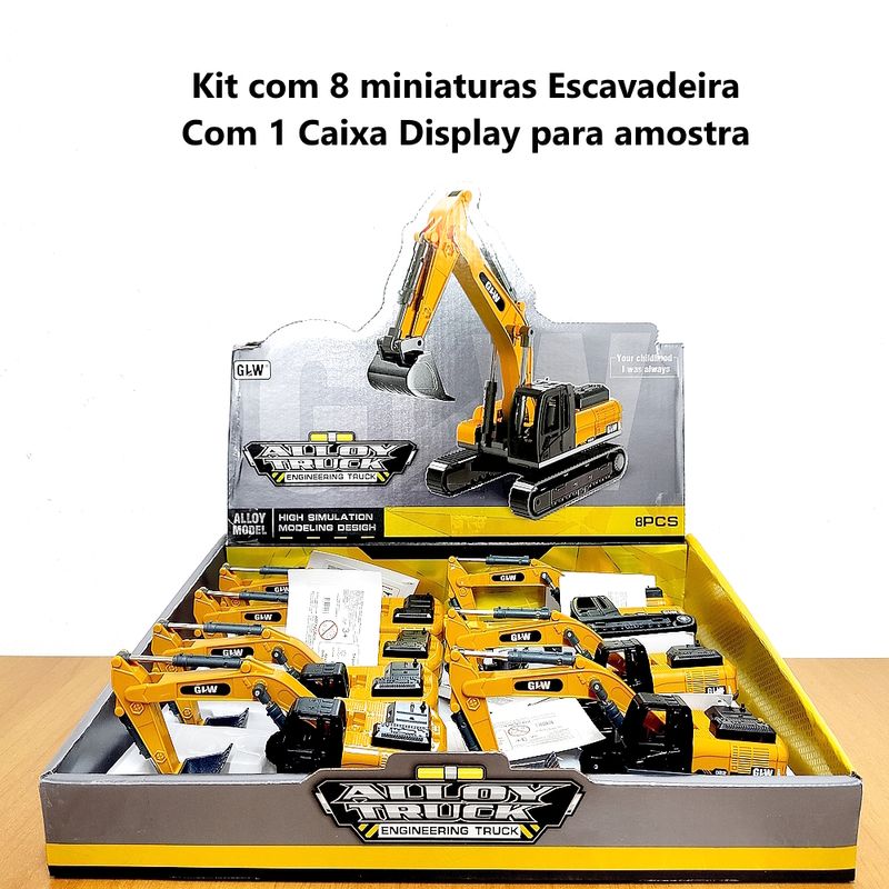 Caixa Display com 8 Escavadeiras de Metal Infantil Realista Articulado Com Esteira de Borracha Atacado Revenda Lembrancinha de Festa Infantil para Sacola Surpresa
