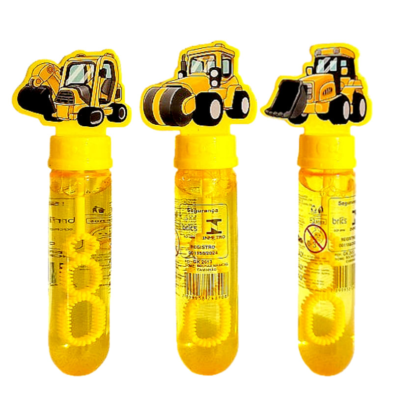 Fazer bolinhas de sabão é super divertido, as crianças soltam a imaginação e interagem entre si. Os tubos de bolhas de sabão são de plástico flexível, não quebra, por isso não tem perigo de machucar. São 3 desenhos de tubos de diferentes: escavadeira, rolo compressor e carregadeira. Cada tubo possui 3 argolas e contém 100 ml de líquido pronto para assoprar e se divertir com as bolhas.