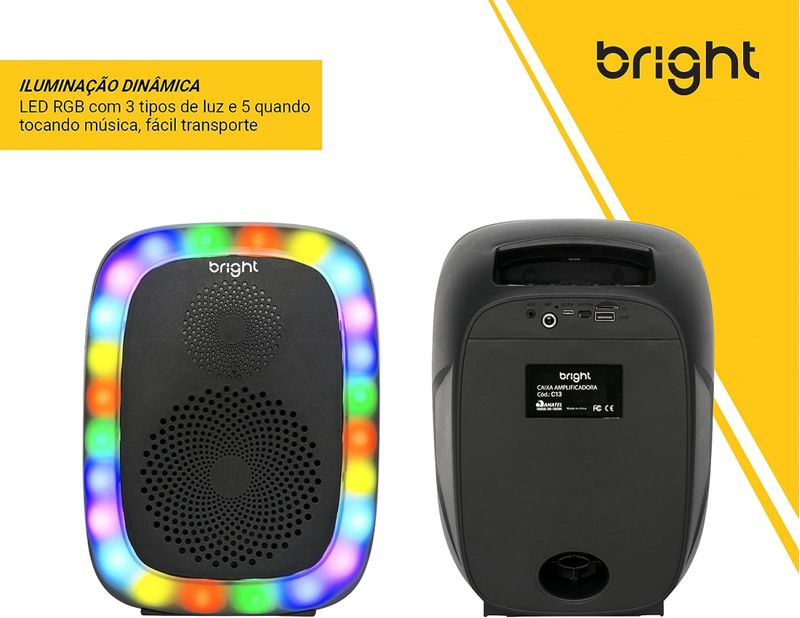 Se você está procurando uma caixa de som com show de luzes para animar osseus eventos, leve, compacta e potente a caixa color boom da Bright irá teacompanhar levando a festa aonde você quiser.Coloque todo mundo para dançar com os efeitos LED RGB com 5 luzes diferentesenquanto a música toca. CARACTERÍSTICAS:- Marca: Bright- Modelo: C13- Medidas: 290 mm (A) x 215 mm (L) x 140 DESIGN: produzida em plástico, acabamento preto fosco, apoiador de mãoatrás para transporte, luzes de LED coloridas, compatível com dispositivoscom conexão Bluetooth e auxiliar, disponível na cor preta ESPECIFICAÇÕES: - Potencia 120W- 5 Modos de iluminação- Radio FM- Função TWS: Conecte duas caixas para amplificar sua experiencia!- Tamanho do speaker: 6.5``- Frequencia: 90Hz - 20kHz- Relação sinal-ruido: 60dB CONECTIVIDADE:- Bluetooth 5.0- 1 Entradas de microfone- 1 Entrada USB- 1 Entrada Micro USB- 1 Entrada Micro SD- 1 Entrada de linha ENERGIA:- Bivolt- USB 5V- Bateria: 3.7V 1500mAh- Tempo de carregamento: 4h- Autonomia de 2h CONTEÚDO DA EMBALAGEM:- Caixa De Som Portátil Bright Color Boom Bluetooth RGB 120W Bivolt - C13 ANATEL: 160562010594 GARANTIA:12 meses PESO:1450 gramas (bruto com embalagem) ESTAMOS SEMPRE A DISPOSIÇÃO!