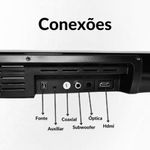 Conectividade: Bluetooth, entrada auxiliar RCA/P2, entrada óptica, entrada HDMI