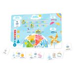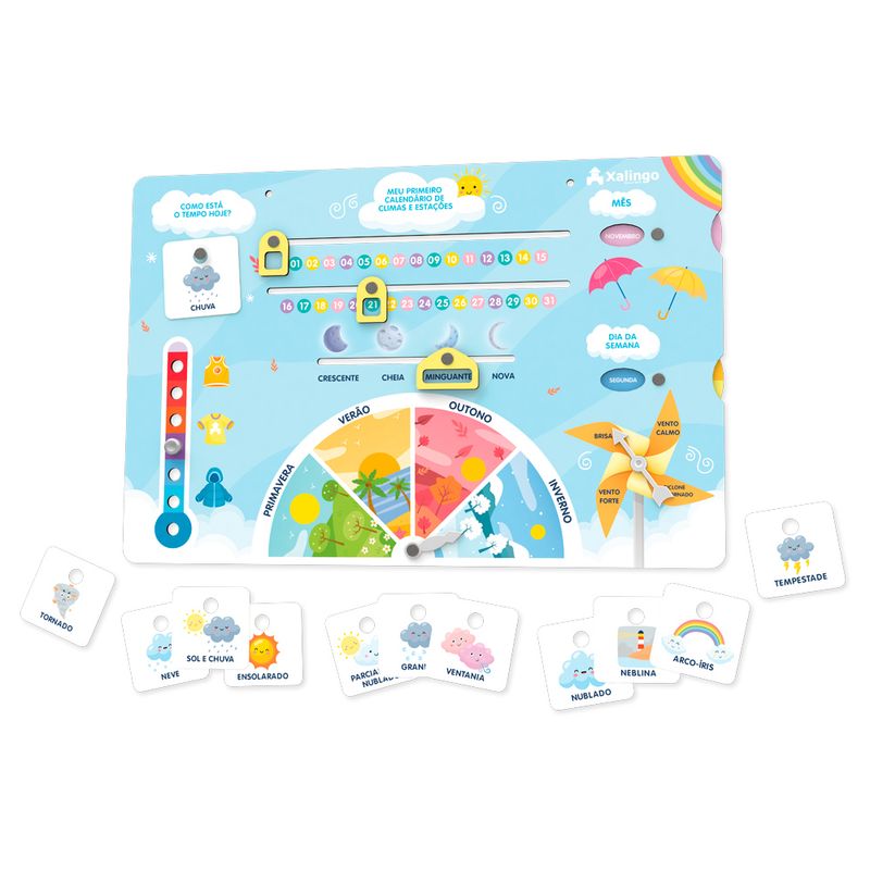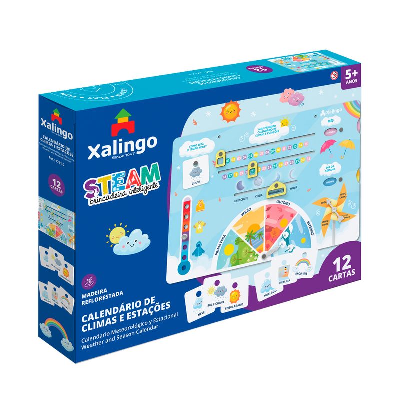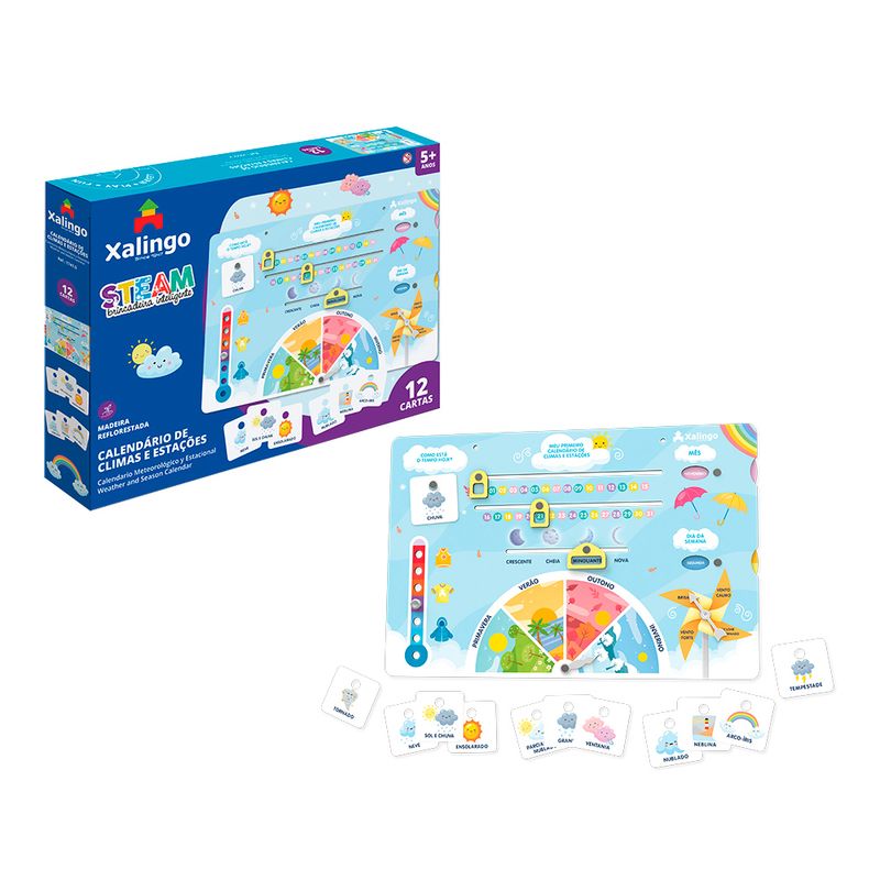 O Calendário de Climas e Estações da linha Steam incentiva as crianças no aprendizado dos diferentes climas, estações do ano, fases da lua, temperaturas, meses e dias da semana, possibilitando a marcação da data atual. O produto é confeccionado em madeira reflorestada e contém 12 cartas. Indicado para crianças a partir dos 5 anos.