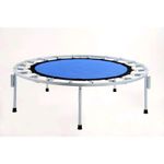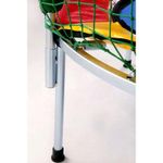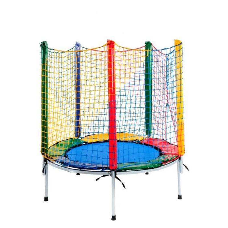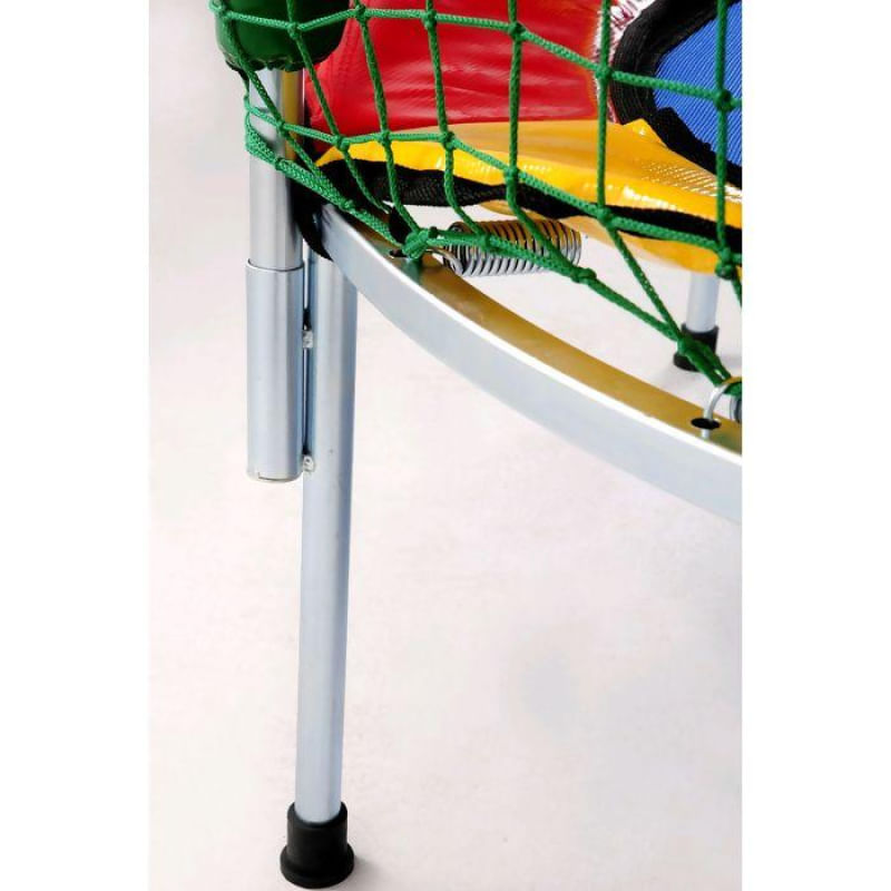 Estrutura em tubo de aço galvanizado pelo processo de zincagem, rede lateral multicolorida, lona de salto em sannet emborrachado, pés individuais com borracha.