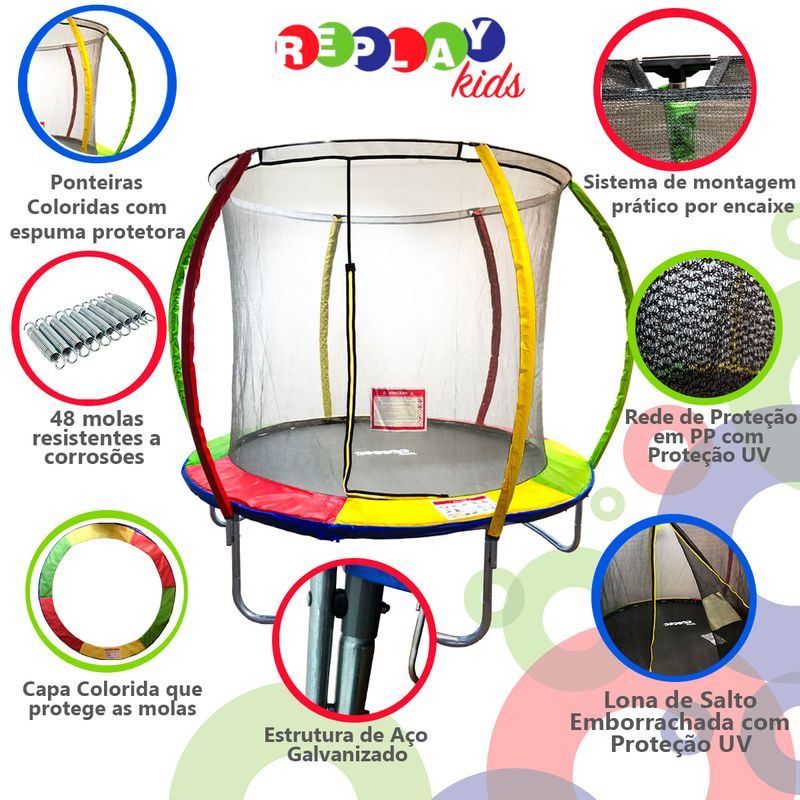 Com a cama elástica da Replay Kids você e sua família poderão desfrutar horas de diversão. Com rede de proteção e zíper para garantir maior segurança, ponteiras coloridas com espuma, molas resistentes, capa colorida que protege as molas, lona de salto emborrachada com proteção UV. Sistema de montagem prático, estrutura em aço. Ideal para diversão em família, eventos, festas e férias escolares. Material Resistente, seguro, prática e durável.
