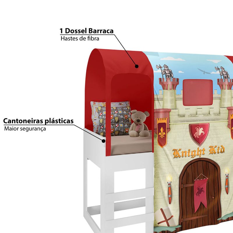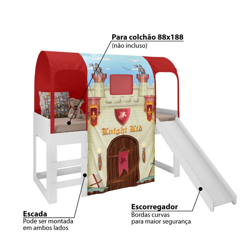 Cama Infantil Alta Joy com Escorregador/Dossel Castelo Forte e Led - Vermelho/Branco