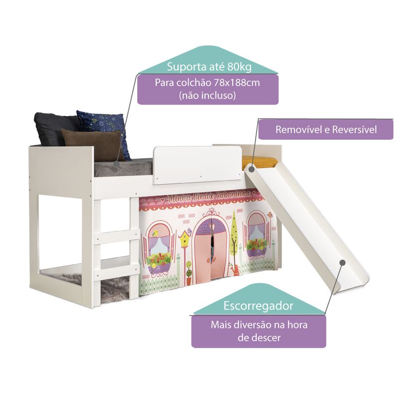 - É possível transformar a cama em uma beliche adquirindo o Kit Estrado para Cama Infantil com Escorregador Branco - Casatema (00017226)