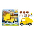 Figuras exclusivas e articuladas de Bluey (com capacete) e Bingo (coberta de lama), permitindo posicionamento na cabine do caminhão para dirigir e brincar de verdade.