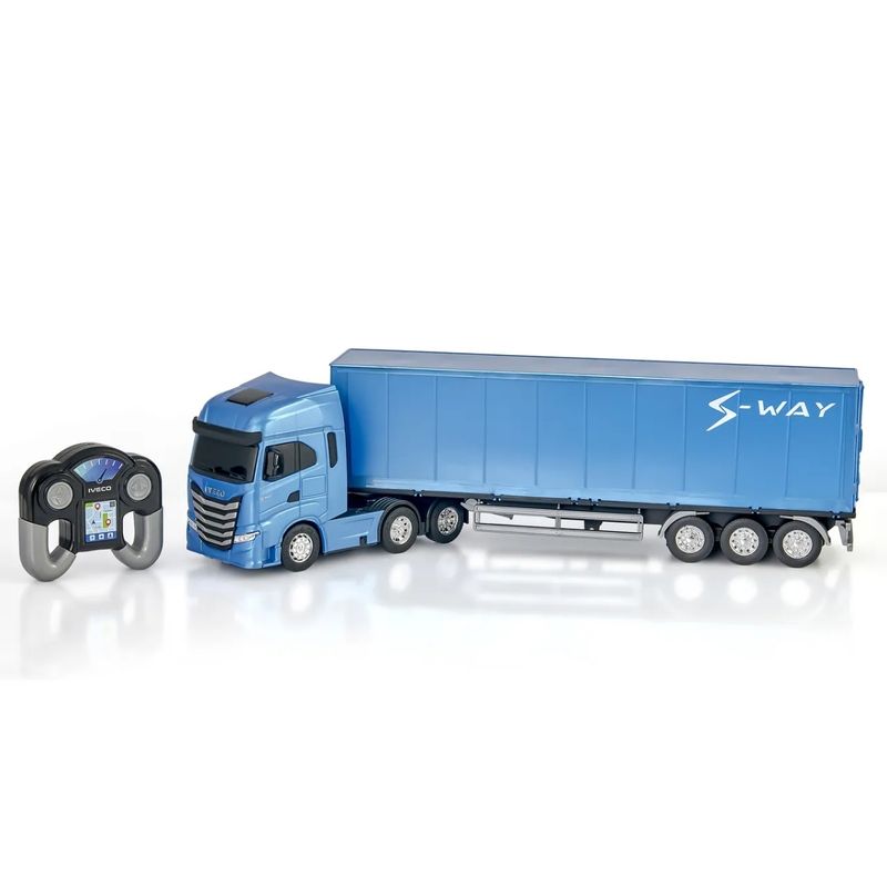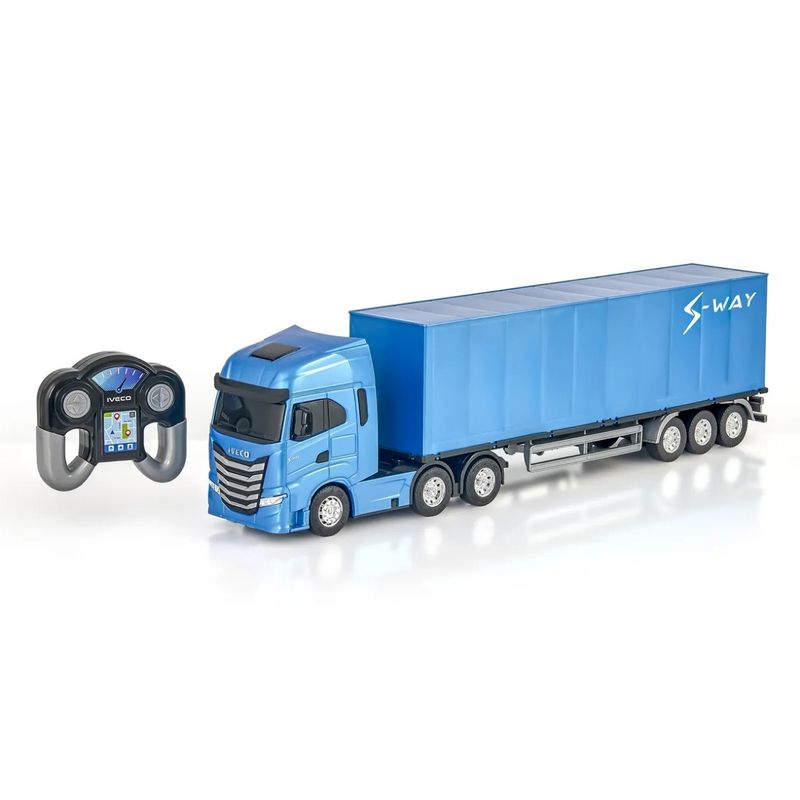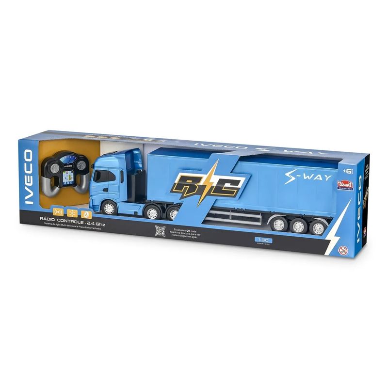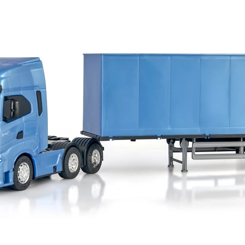 O Iveco S-Way Baú Controle Remoto apresenta um acabamento detalhado, com rodas cromadas, um implemento baú com portas traseiras que se abrem e um design frontal que reproduz as características marcantes da versão real do caminhão.