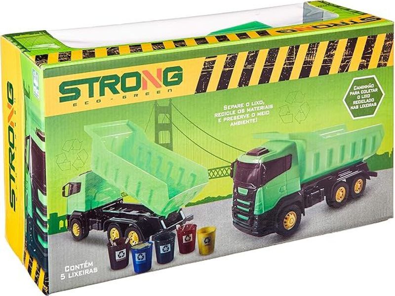 Caminhão Strong Eco Green é feito de materiais super resistentes, coloridos e com detalhes iguais aos de verdade. Ele acompanha 5 lixeiras para a coleta seletiva do lixo. Tamanho do Caminhão: 33,0 x 13,0 x 18,0 cm