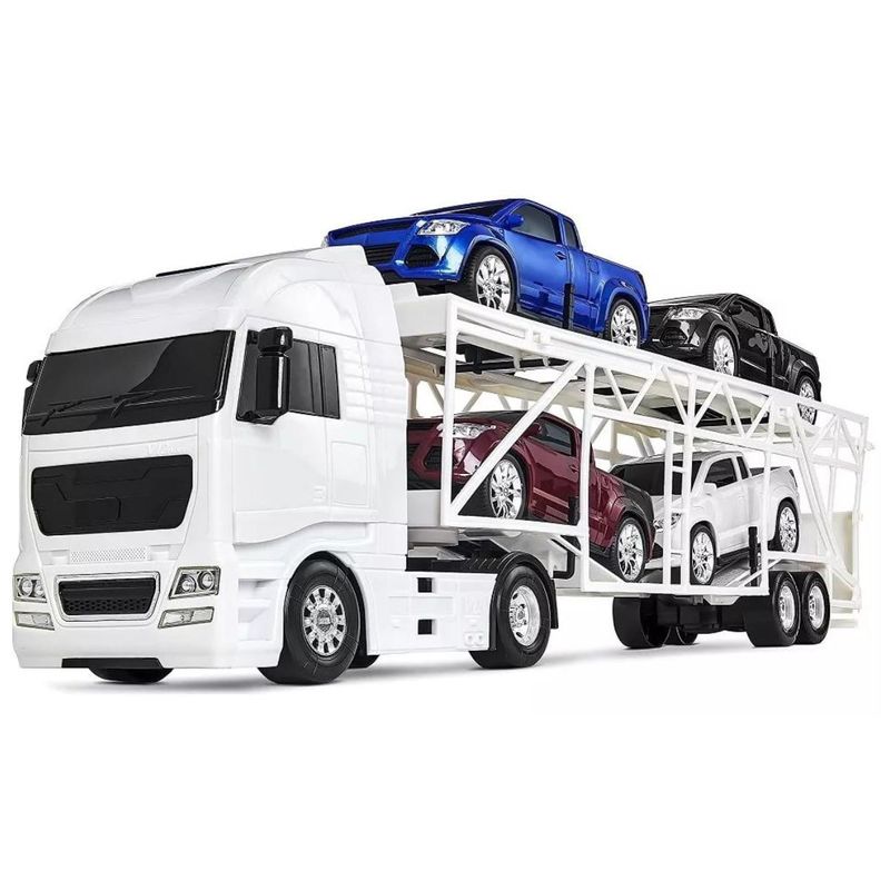 Com este caminhão cegonheira de brinquedo, seu filho vai brincar de transportar 4 lindas pick-ups.