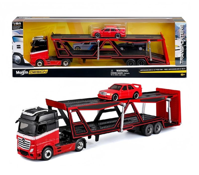 Caminhão Mercedes-Benz Actros 1851 + 1990 Mercedes-Benz 190 E Marca do produto: Maisto. Coleção: Transporters Escala: 1/64 Tamanho: - Caminhão Cegonha: 31 cm de comprimento - Carro: 7 cm de comprimento Miniatura em Metal com partes de Plástico. Contem: 1 Caminhão Carreta Cegonha e 1 Carro