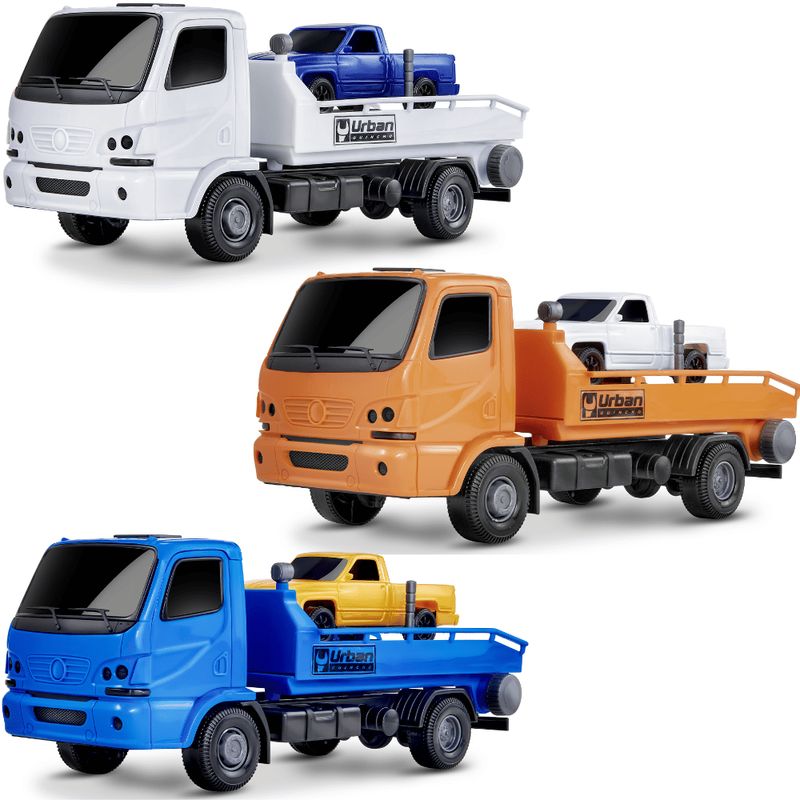 Os pequenos vão se encantar pelo Caminhão Urban Guincho. Ele acompanha uma caminhonete e possui uma rampa deslizante e um sistema que trava a caminhonete na plataforma, tornando a brincadeira muito mais real.