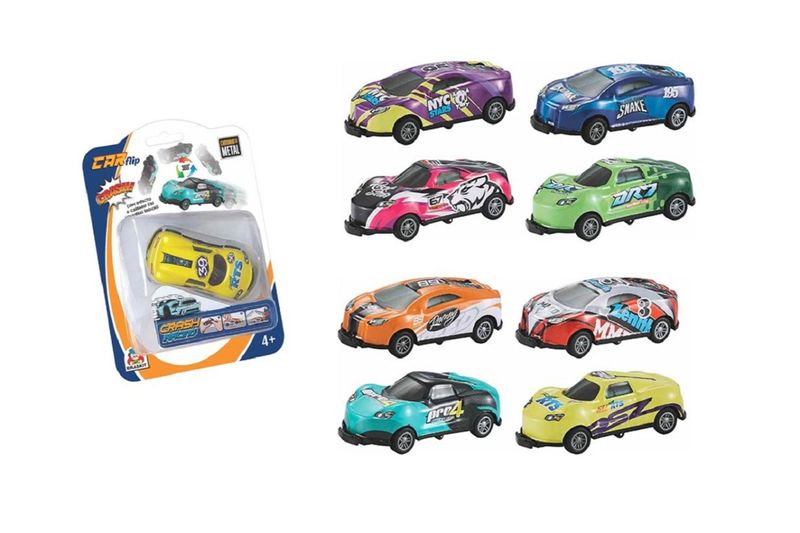 Carrinho de metal movido a fricção, quando bate na parede realiza manobras radicais.