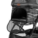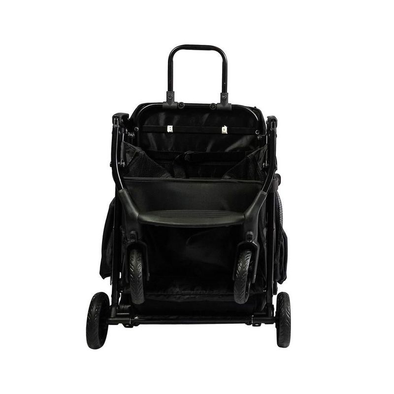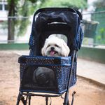 Tem colchonete confortável e com capa lavável, mais segurança com os ganchos duplos para prender um ou dois cachorros, capota ampla, retrátil e com tela de proteção acoplada, prende com velcros use aberta ou fechada, manopla emborrachada, fechamento compacto com apenas uma das mãos, alça de mão para carregar, freios, rodas dianteiras com giro 360° e trava de movimento, bolsos laterais e traseiro para pequenos itens e cesto porta-objetos, 2 tipos de abertura frontal traseira, com telas para deixar mais arejado e visível. Confeccionado em tecido fácil de limpar que pode ser removido para lavar à máquina em ciclo delicado.
