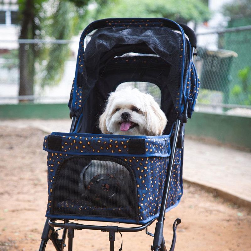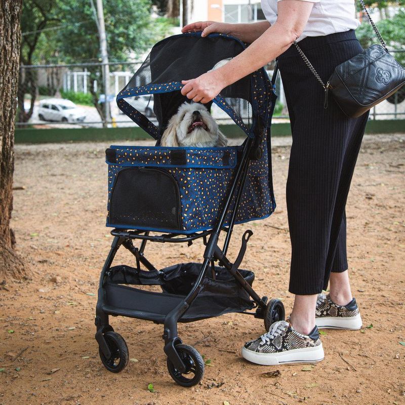 Prático e leve, fechamento fácil com apenas uma das mãos, ampla capota com tela protetora, 2 opções de abertura e gancho duplo para segurança dos cachorros nos passeios.