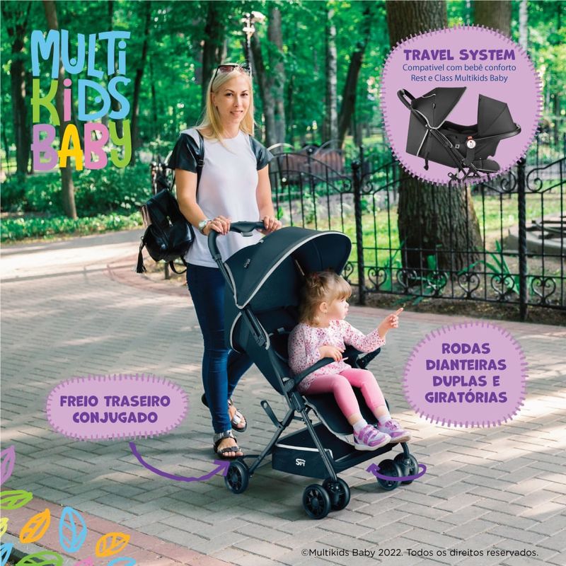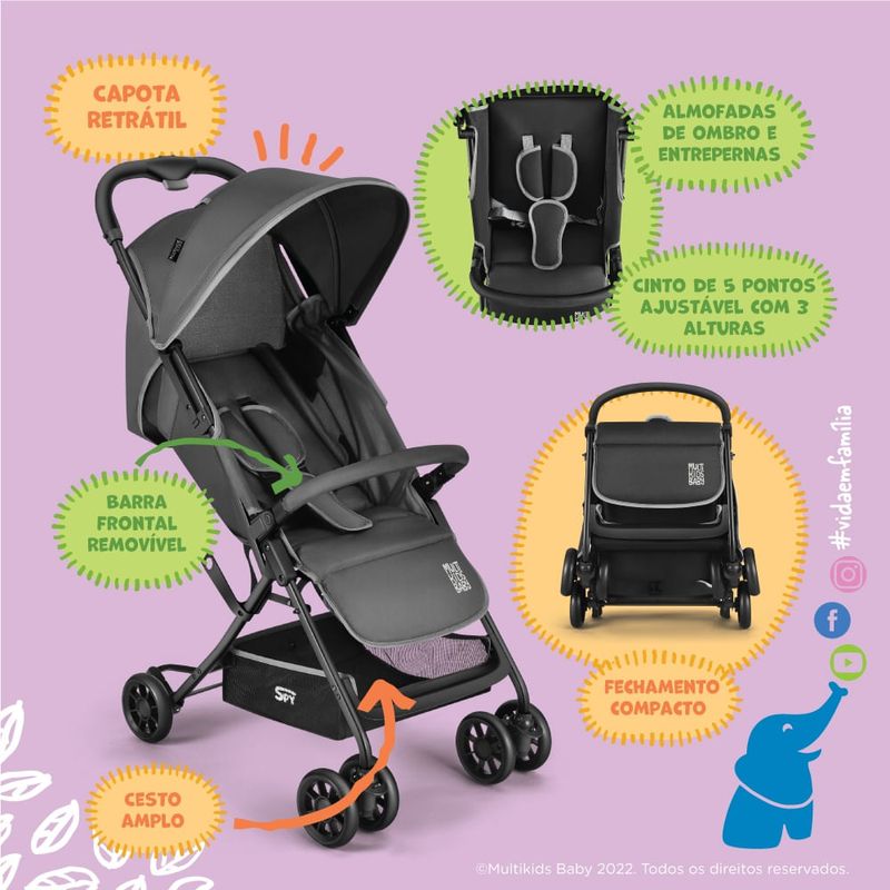 O carrinho de bebê dobrável e compacto Multikids Spy foi desenvolvido para que toda família possa curtir os passeios. Desenvolvido pensando na segurança e conforto da criança, é como uma extensão do colo dos pais.