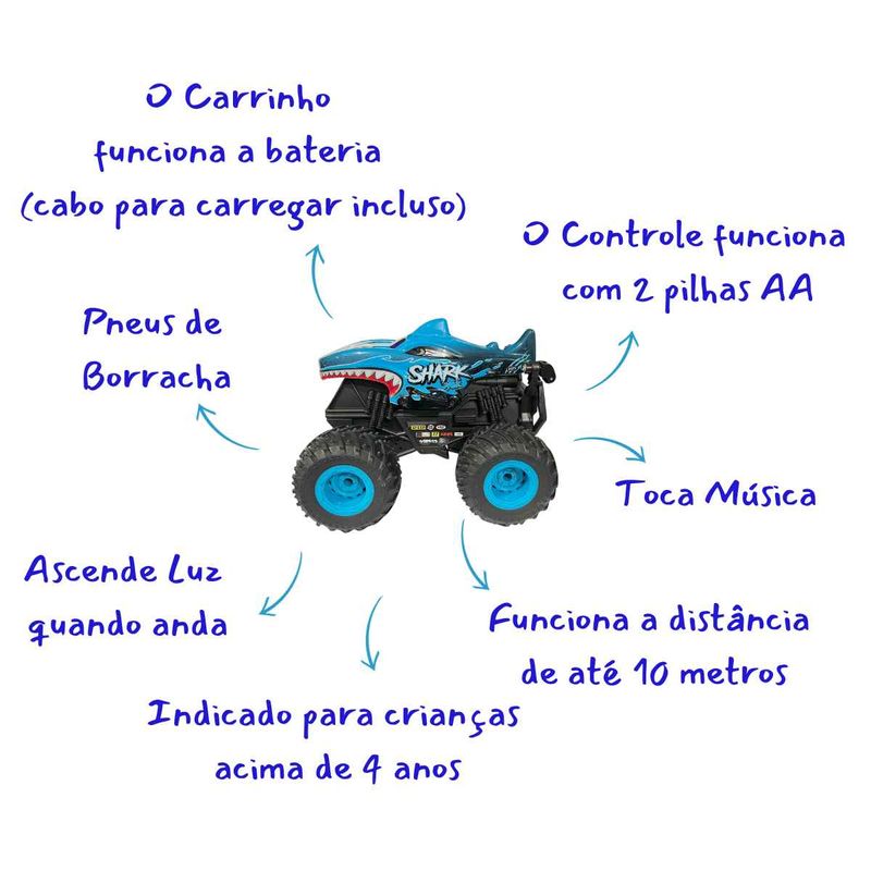 Conteúdo da Embalagem: 1 carrinho, 1 controle, 1 bateria, 1 cabo para carregar