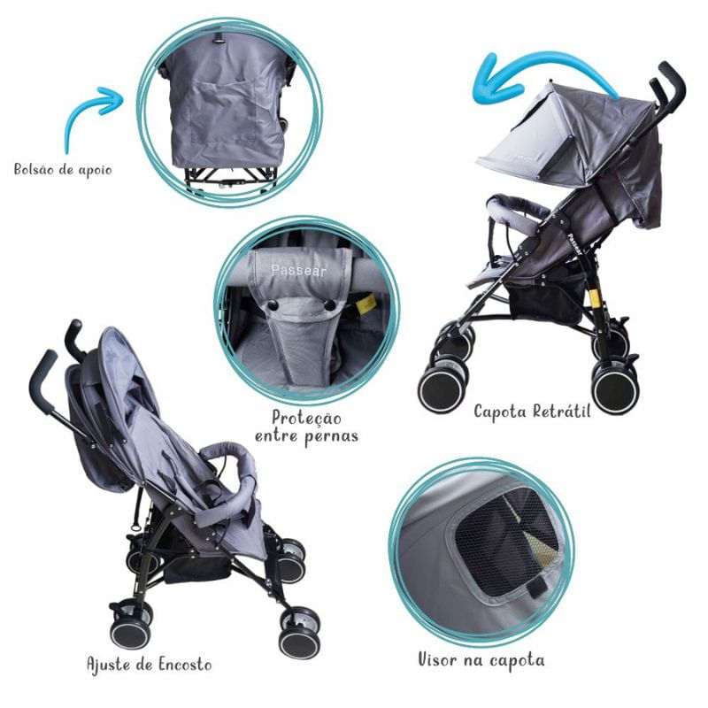 Este carrinho conta também com ajuste de encosto, permitindo que o bebê descanse confortavelmente em diferentes posições, proporcionando uma experiência personalizada de acordo com as necessidades dele.