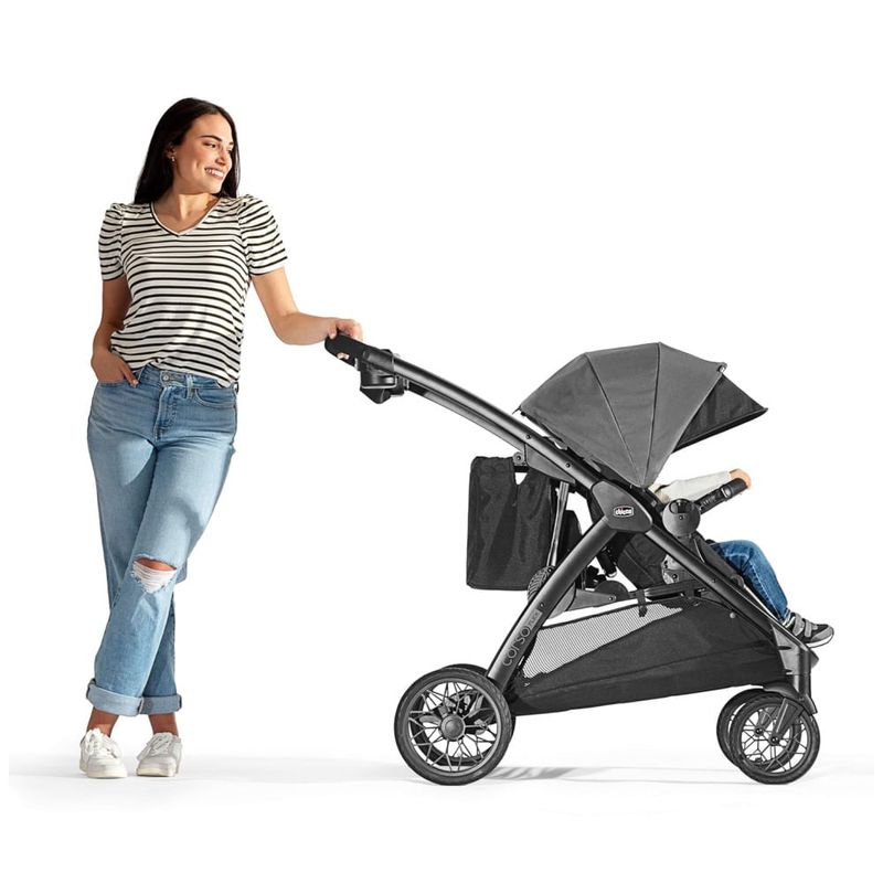 Compatível com todos os assentos de carro infantis Chicco, o Corso Flex se converte em um carrinho de bebê com estrutura e uma cesta adaptadora para assento de carro infantil incluída. Além do cesto de carrinho extragrande com acesso frontal e traseiro, o componente de cesto de compras incluído pode ser montado na posição superior, enquanto o adaptador de assento de carro infantil oferece ainda mais opções de armazenamento quando usado sem um assento de carro infantil. O assento da criança também possui um bolso de malha na parte de trás do assento.