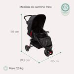 O colchonete acolchoado é removível e lavável, garantindo mais conforto e higiene no dia a dia. A estrutura com três rodas proporciona uma condução suave e estável, enquanto o apoio de pés ajustável acompanha o crescimento do bebê. A barra frontal pode ser retirada com facilidade, e o cinto de 5 pontos tem ajuste de altura, combinando segurança com bem-estar.