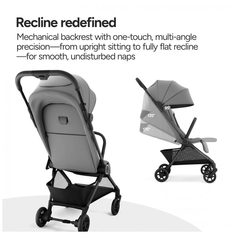 Dispõe de assento ergonômico com tecido em poliéster respirável e revestimento 3D para conforto prolongado. A reclinação ajustável atinge 170°, permitindo posições desde sentado para observação até quase horizontal para descanso contínuo. Possui protetor para os pés do bebê, faixa segura para recém-nascidos e cinto de segurança de 5 pontos com ajuste rápido.