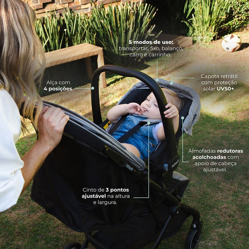 Alça com 4 posições para 5 modos de uso: transportar, instalar no carro, fixo, balanço e encaixe no carrinho.