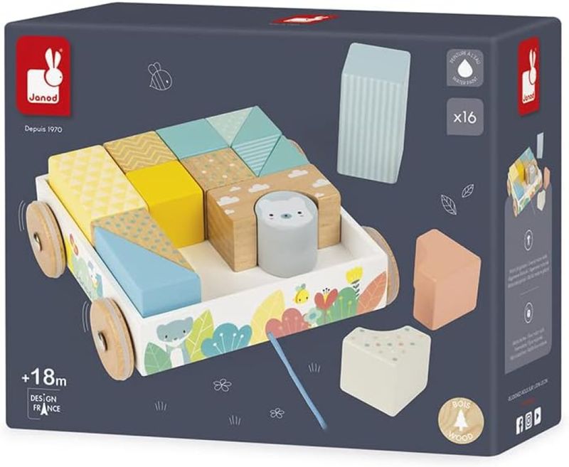 Um lindo carrinho de madeira para passear em tons suaves e muito atuais, com animais adoráveis para desenvolver a motricidade do bebê. Com os diversos cubos de madeira, ele também irá aprender sobre formas e cores, estimulando sua coordenação e destreza. Rodas de madeira com borracha antiderrapante. Inclui 16 cubos.