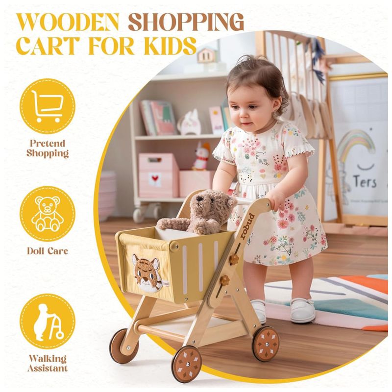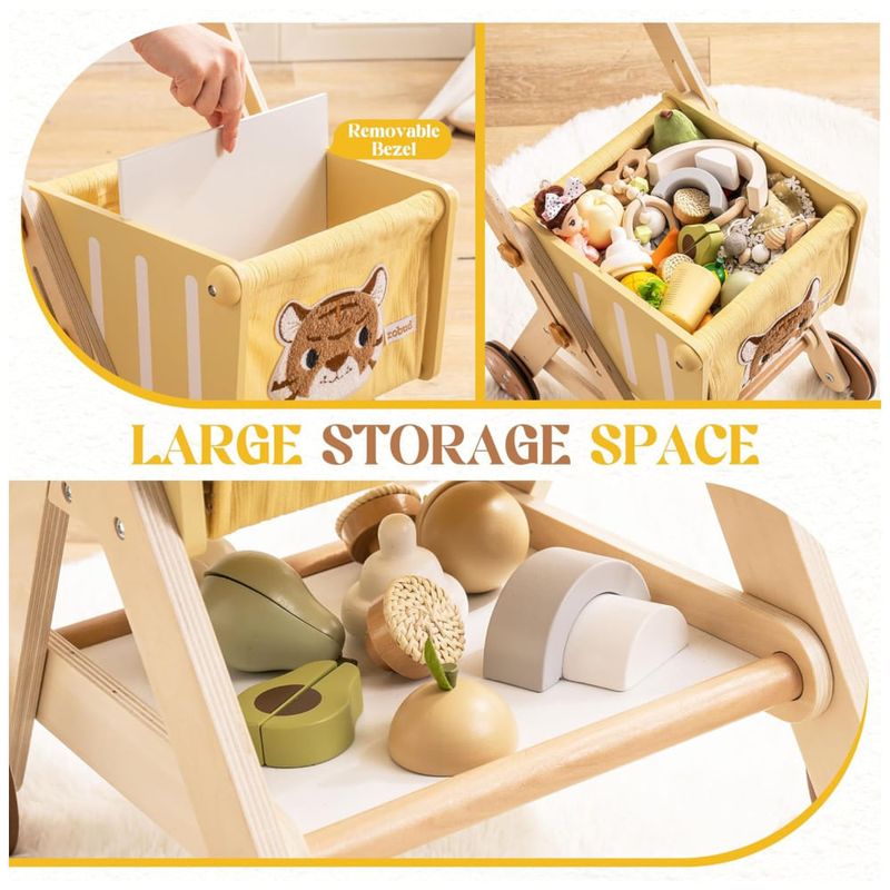 Design lúdico do Rei da Floresta: O Carrinho de Compras Infantil Forest King apresenta um design de cabeça de tigre lúdico, adicionando um toque de aventura à hora de brincar. Sua aparência cativante estimula a imaginação e convida as crianças a embarcarem em jornadas de compras imaginativas. Carrinho Adaptável: Não é apenas um companheiro de compras, este carrinho também funciona como um andador para crianças em diferentes estágios de desenvolvimento. Sua altura ajustável acomoda bebês aprendendo a andar e aqueles explorando confiantemente o ambiente ao redor. Amplo Espaço de Armazenamento: Este carrinho oferece espaço de armazenamento acima e abaixo, apresentando um espaço espaçoso com um divisor removível. Espaço suficiente é fornecido para brinquedos, pelúcias e outros tesouros, promovendo organização e ordem durante a brincadeira. Design Amigo da Criança: Feito de madeira resistente com bordas arredondadas para segurança, este carrinho prioriza durabilidade e design amigo da criança. Rodas silenciosas garantem movimento suave e tranquilo em qualquer superfície, permitindo que as crianças naveguem pela área de brincadeira sem serem perturbadas. Além disso, a sacola de tecido removível oferece conveniência adicional para armazenar itens ou carregar brinquedos. Presente Empolgante: Este carrinho de compras não é apenas um presente, é uma jornada esperando para ser explorada! Perfeito para aniversários, Natal, Dia das Crianças ou qualquer ocasião, ele garante emoção, aprendizado e diversão ilimitada para as crianças. Fácil de Montar: Siga as instruções de montagem no manual passo a passo, prestando atenção especial à instalação das arruelas das rodas. A instalação correta é crucial para garantir a rotação suave das rodas. Se as rodas não estiverem se movendo, verifique se as arruelas estão instaladas corretamente. A colocação incorreta das arruelas pode fazer com que as rodas fiquem presas.