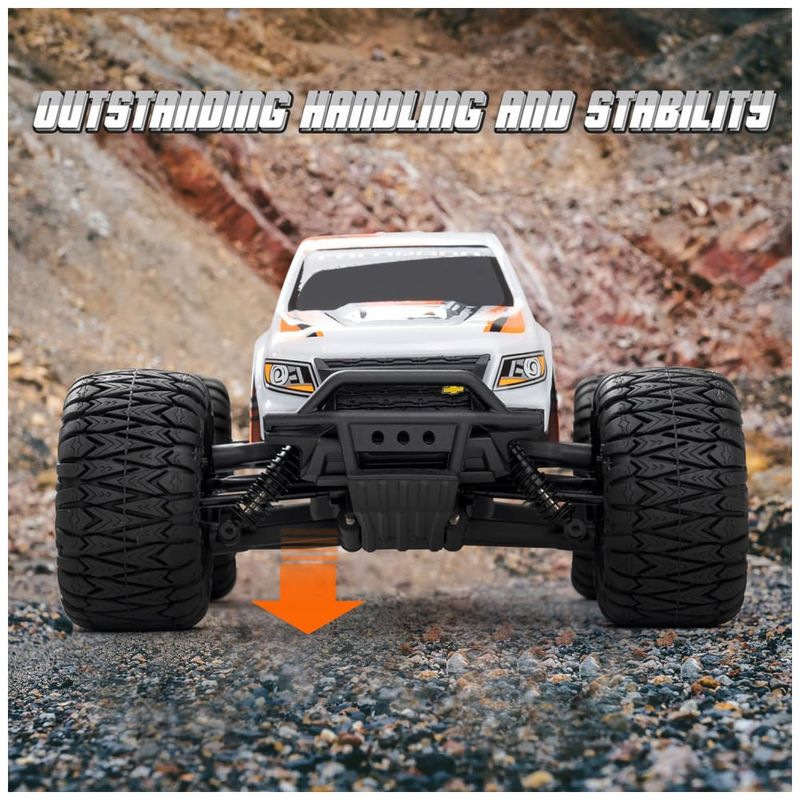 Este Monster Truck RC com carroceria Chevrolet oficial autorizada está disponível em três cores vibrantes e é equipado com decalques que melhoram a aparência e identificação do carro. A carroceria utiliza nylon de alta resistência, o que prolonga a vida útil do carro RC, além de ser ecologicamente correta e reciclável, reduzindo o impacto ambiental.