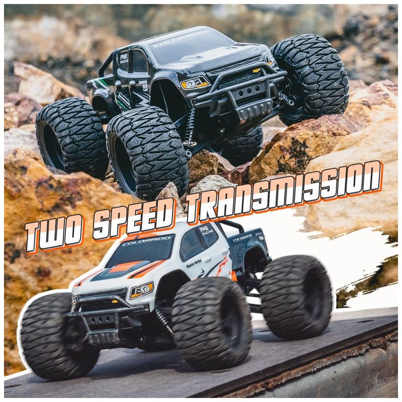 O veículo RC vem com uma transmissão mecânica de duas velocidades, permitindo condução offroad lenta e desempenho em alta velocidade. Sua capacidade de lidar com diferentes terrenos é melhorada por um sistema de suspensão independente nas quatro rodas e diferenciais de engrenagem planetária nos eixos dianteiro e traseiro. Além disso, a carcaça do carro possui um design de liberação rápida fácil de usar, facilitando reparos ou substituições. Este Monster Truck RC oferece maior flexibilidade, estabilidade e adaptabilidade.