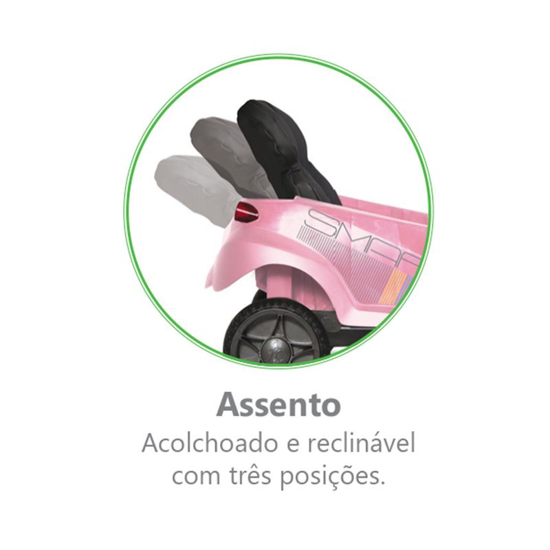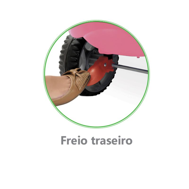 Possui freio traseiro, assento acolchoado e reclinável com três posições, cinto de segurança de três pontos, haste removível, capota articulável, piso retrátil que converte rapidamente o brinquedo nas funções Passeio e Passo-a-Passo, rodas em E.V.A. que facilitam a condução do carrinho e proporcionam um deslocamento suave e sem ruído, rodas dianteiras com giro de 360°, suporte para garrafa d'água, mamadeira ou squeeze, painel de atividades e volante com buzina.