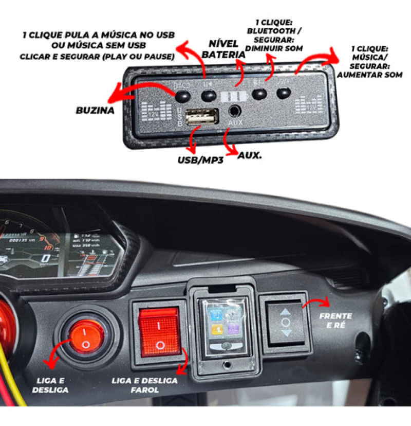 Entrada USB/MP3. Funções Controle: Frente, Ré, Direita e Esquerda.