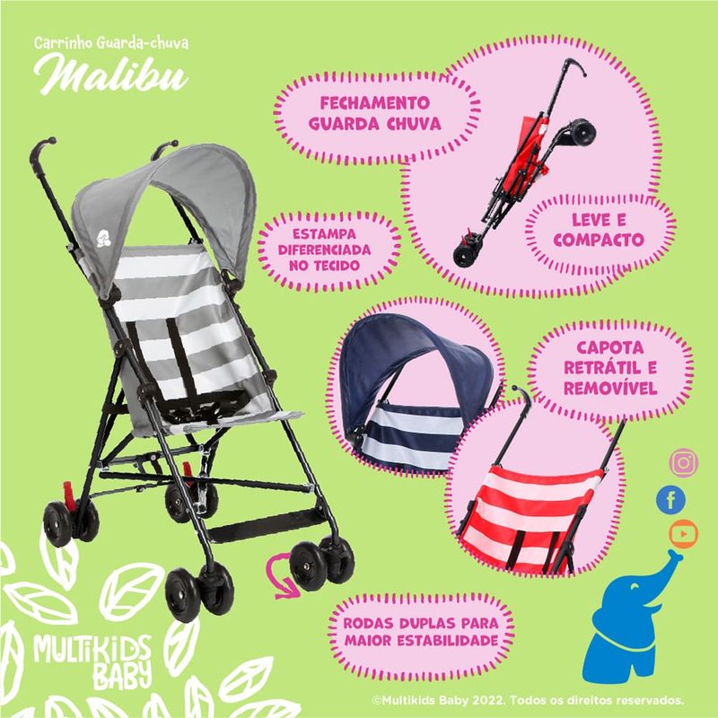 Com estampa listrada e alinhada com as tendências esse carrinho oferece mais segurança e praticidade. Leve, o Malibu tem fechamento em estilo guarda-chuva, ficando super compacto depois de dobrado e fácil de carregar sendo perfeito para qualquer passeio!