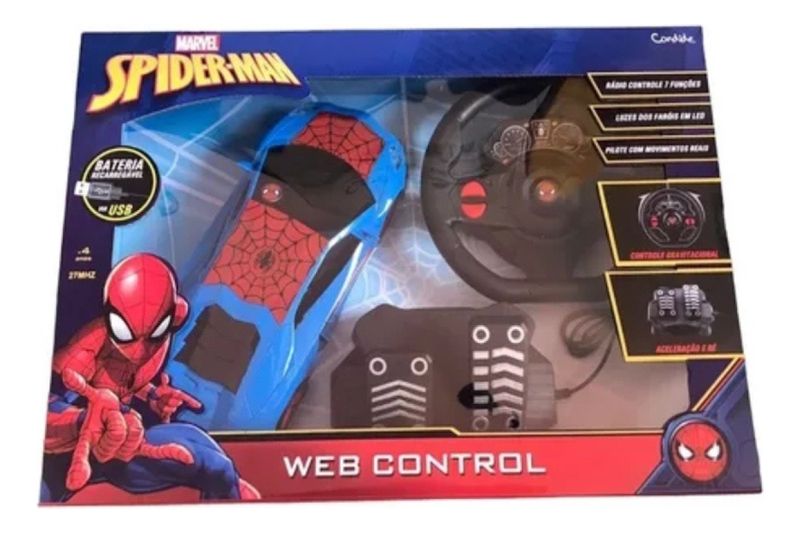 Carro Controle Remoto Homem Aranha Webcontrol Recarregavel Candide! O Veículo Turbo Tiger vai encantar os amantes de carros. Ele é um fantástico veículo de controle remoto de volante 7 funções e pedais para acelerar e dar ré, podendo ser pilotado para todas as direções e um design arrojado estilo carro de corrida esportivo.