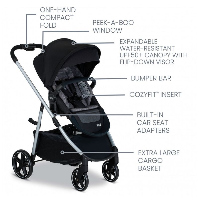 ulli MAIS MANEIRAS DE PASSEAR O assento reversível muda facilmente da posição voltada para os pais para a frente, para que seu filho possa olhar para você ou para o mundoliliFEITO PARA DURAR O carrinho portátil oferece toda a durabilidade sem o peso extraliliTECIDOS LAVÁVEIS, STAYCLEAN E LAVAGEM SEGURA O inserto CozyFit é fácil de lavar e secar e o forro do carrinho e a almofada de cabeça resistem a manchas, umidade e odoresliliCARRINHO PORTÁTIL Feito para multitarefas, este carrinho leve dobra se facilmente com uma mãoliliSAMO PARA CRESCER O inserto CozyFit permite que o bebê ande no assento do carrinho a partir de 10 libras e pode ser removido para acomodar crianças de até 50 librasliMAIS ARMAZENAMENTO Cesto de carga extra grande e cinco bolsos adicionais para guardar objetos de valor, bebidas e seus pequenos devem terslili ASSENTO RECLINÁVEL A criança pode descansar confortavelmente em movimento ou sentar se ereta para apreciar a vistaliliBUMPER BAR Fixa se à estrutura do carrinho, proporcionando ao seu filho um lugar para descansar os braçosliliUPF 50 CANOPY Britax carrinho com capota UPF 50 com viseira solar rebatível e janela peekabooliliSEM QUÍMICOS FR ADICIONADOS Tecidos naturalmente retardantes de chama sem adição de produtos químicos FRliul