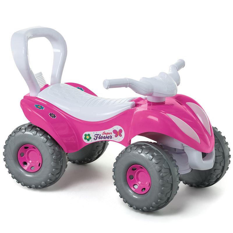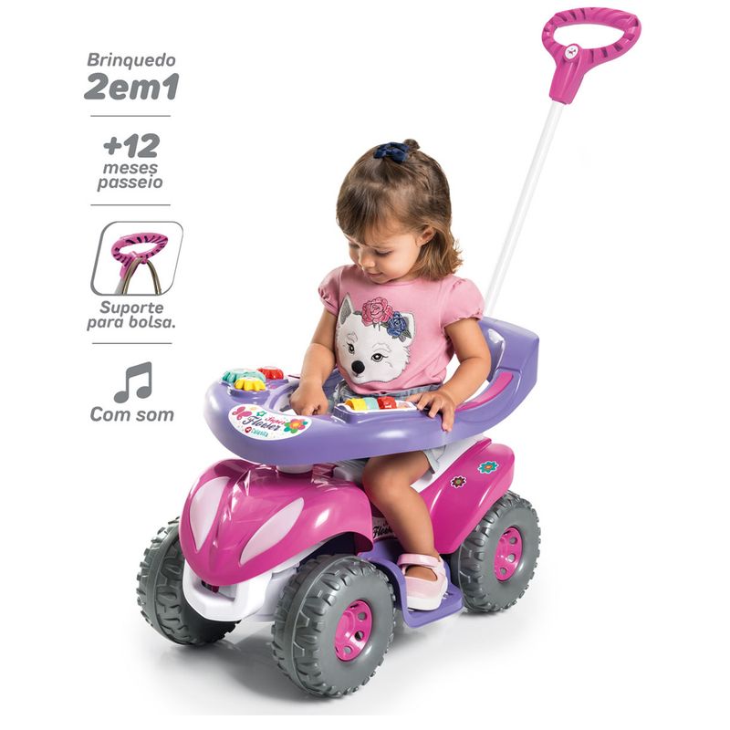 A diversão vai além da versão passeio. Para a diversão continuar com a versão passo a passo, é só desencaixar o aro protetor, retirar os apoios de pé e a haste, e encaixar o suporte antitombo, e pronto!