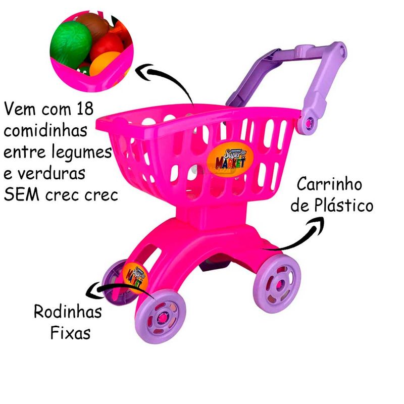 Conteúdo da embalagem: 01 Carrinho de Compras 01 abacaxi,01 acelga,o1 goaiaba,01 laranja,01 pepino,01 uva,01 beterraba,01 manga,01 banana,01 pimentão,01 cebola,01 pera,01limao,01 cenoura,01 tomate,01 macã,01 batata, 01 milho.