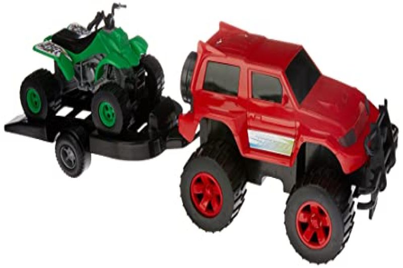 Carrinho Roda Livre - TX8 Trilha - Jipe Com Quadriciclo: as crianças aproveitam toda a diversão de uma trilha com Jipe e Quadriciclo TX-8. O Jipe TX-8 é um veículo 4x4 com detalhes muito legais, acompanhado de uma carreta e quadriciclo. Os veículos possuem rodas livres para as crianças empurrarem sem dificuldades, design detalhado, produzido em material robusto e com adesivos temáticos. O jipe vem com um porta pneu, que abre e fecha, para você guardar o que quiser