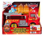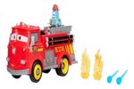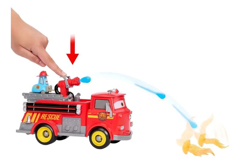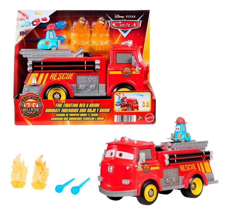 Este produto é um brinquedo da linha Disney Pixar Cars, fabricado pela Mattel, chamado "Fire Fighting Red & Guido". Trata-se de um conjunto de veículos inspirado nos personagens Red, o caminhão de bombeiros, e Guido, o pequeno guindaste azul, ambos do universo Radiator Springs. A embalagem apresenta: Um caminhão de bombeiros vermelho com detalhes prateados, rodas amarelas e a inscrição “RESCUE” na lateral. Um pequeno veículo azul (Guido) com chapéu de bombeiro vermelho e dois “jatos de água” azuis. Dois acessórios em forma de chamas para simular incêndios. O conjunto é indicado para crianças a partir de 3 anos e permite brincar de apagar incêndios, simulando o lançamento de água pelos jatos. A frente da embalagem traz o logotipo "Radiator Springs Race & Rescue" e instruções visuais mostrando como o brinquedo funciona.