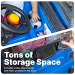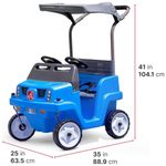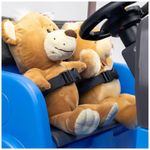 Equipado com cintos de segurança ajustáveis de fácil encaixe, volante funcional com buzina, porta-copos e um compartimento sob o capô para armazenar lanches e brinquedos, garantindo segurança e entretenimento durante o passeio.