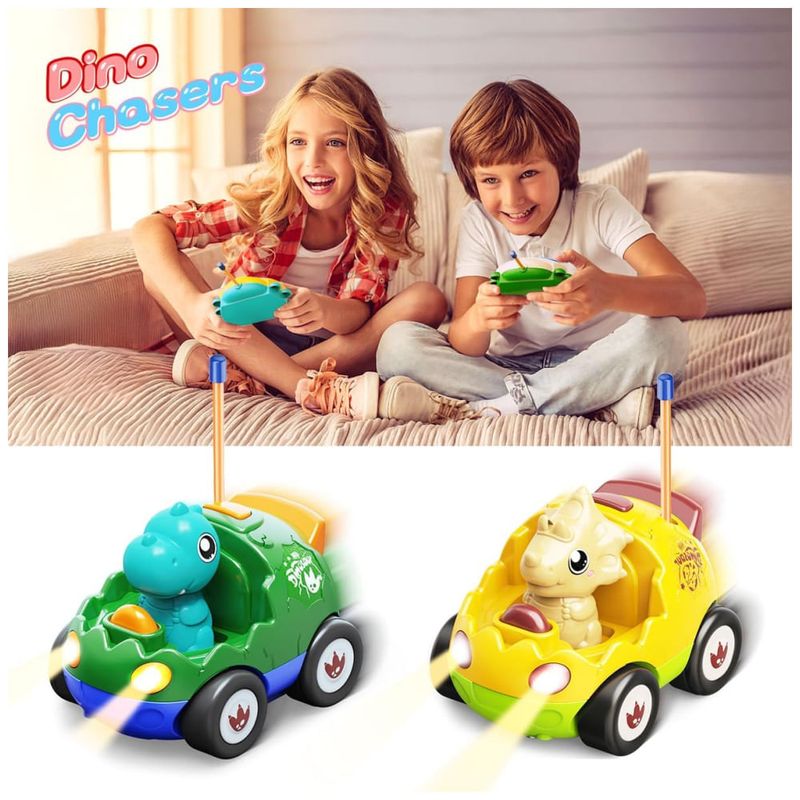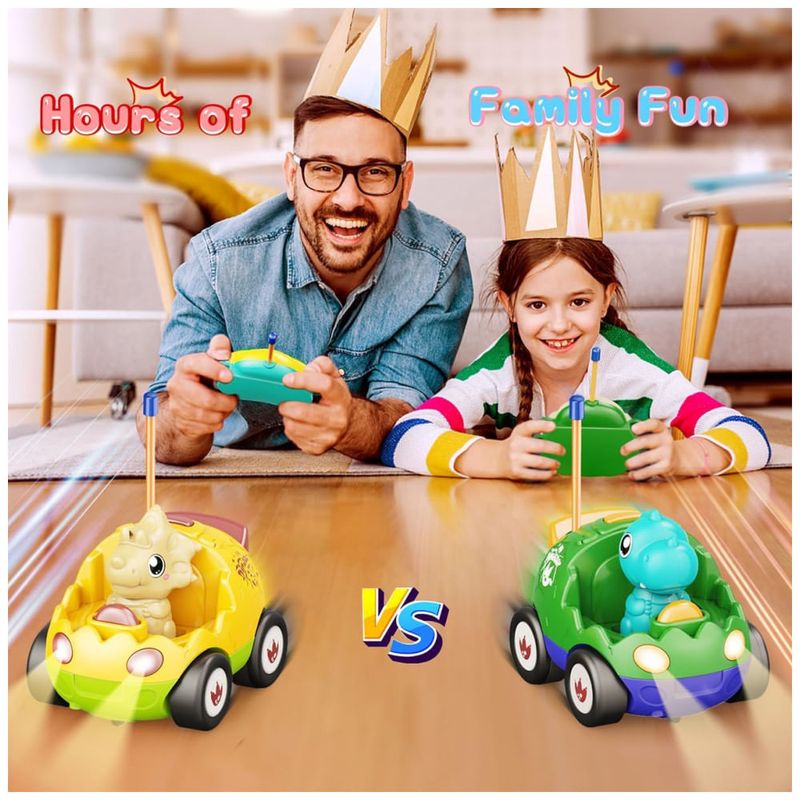 Este conjunto inclui dois carros de controle remoto em forma de ovo para crianças, com recursos de música, som e luz. Além disso, vem com duas figuras de dinossauros intercambiáveis e dois controles remotos que movem os carros para frente e para trás para a esquerda. Os carros são fáceis de mover para qualquer lugar graças aos controles remotos de botões grandes. Ambos os carros podem ser jogados ao mesmo tempo e têm sons de motor realistas, música, sons de buzinas e faróis piscando.