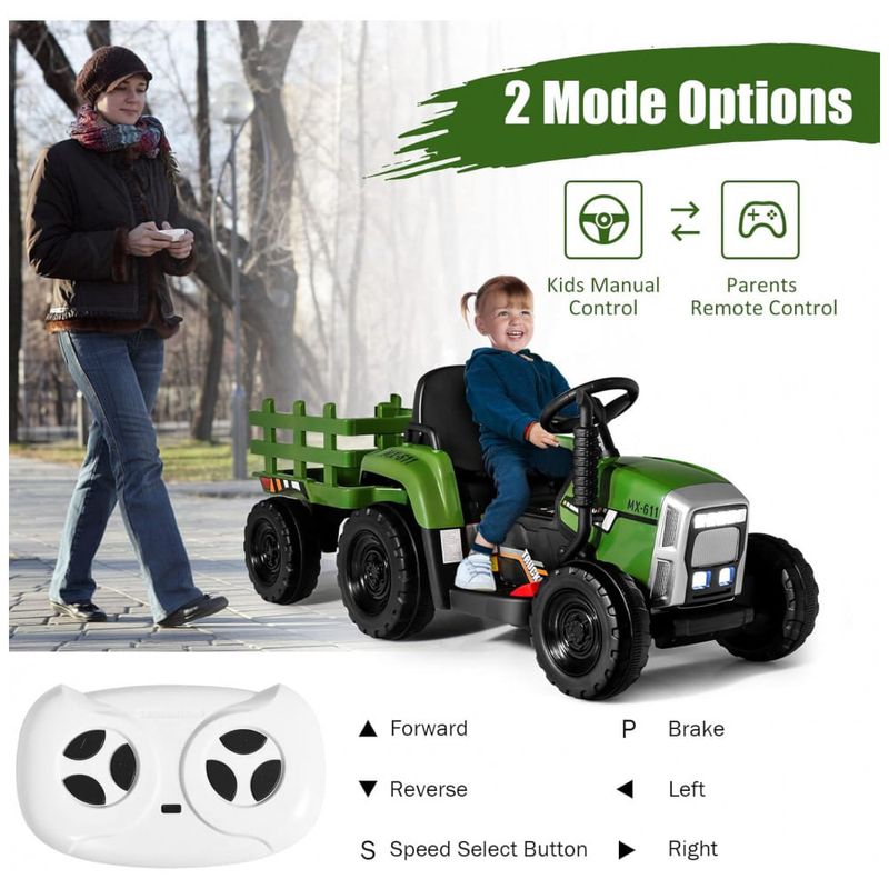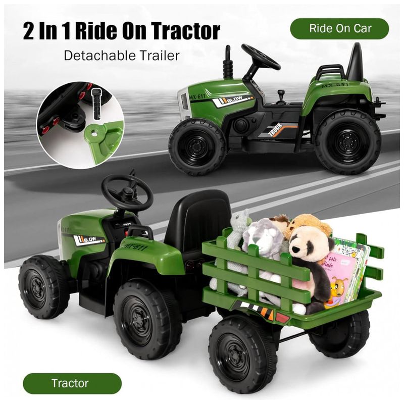 Design 2 em 1 com desempenho premium O trator elétrico possui um reboque destacável, oferecendo versatilidade para atender diferentes necessidades. O trailer pode transportar itens leves, como livros e brinquedos. Quando removido, o trator se transforma em um carro alimentado por uma bateria recarregável de 12V. As crianças podem desfrutar de um passeio emocionante, com velocidades variando de 3 a 8 km.