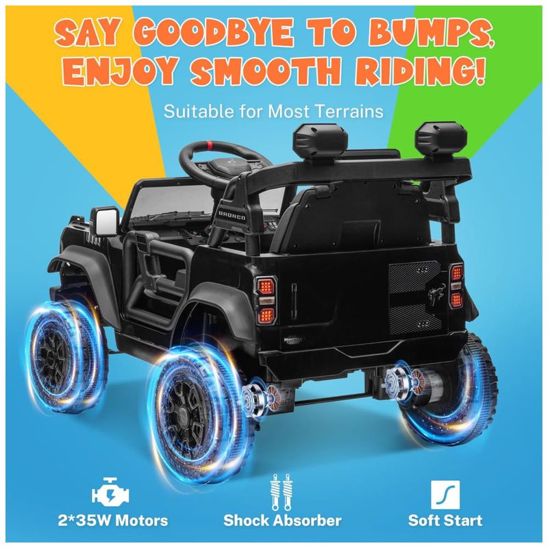 Equipado com dois motores de 35 W e uma bateria recarregável de 12 V 7 Ah, o carro pode atingir uma velocidade baixa de 1,9 km/h para os menores e até 4 km/h para os mais aventureiros. Com um botão START, indicador de carga da bateria e carregador incluso, ele é fácil de operar e oferece horas de diversão.