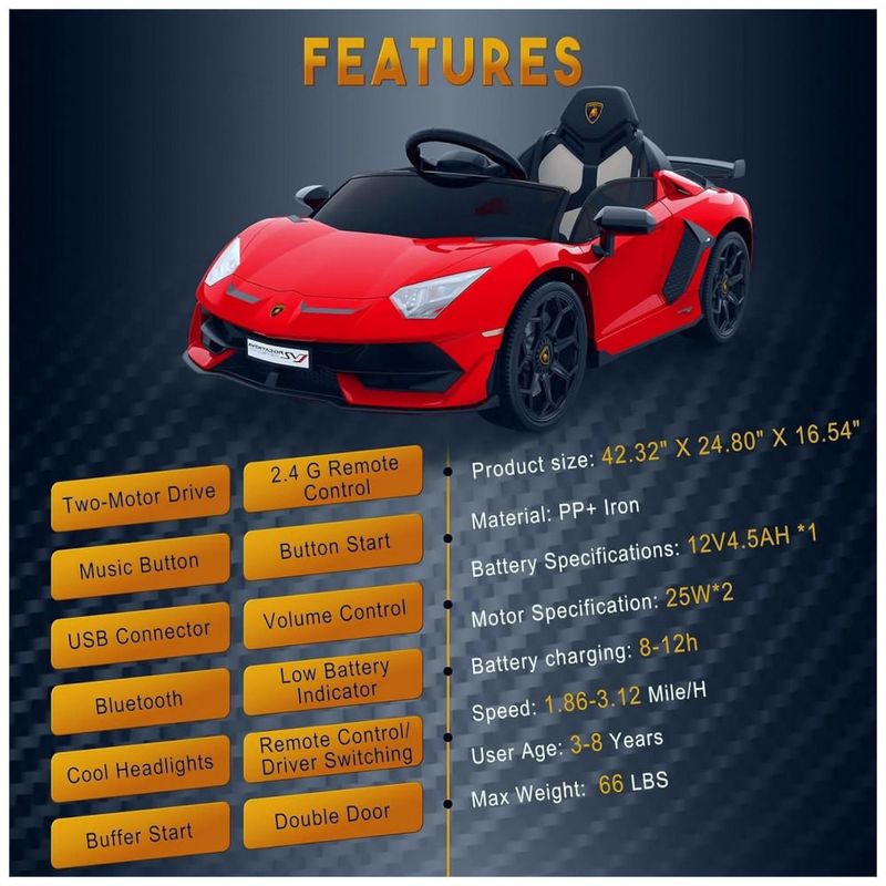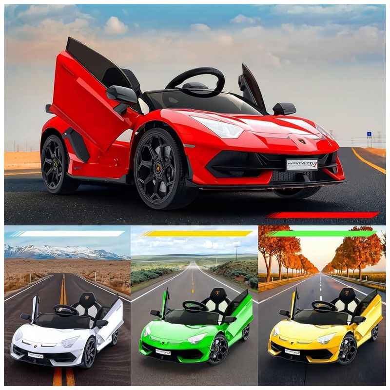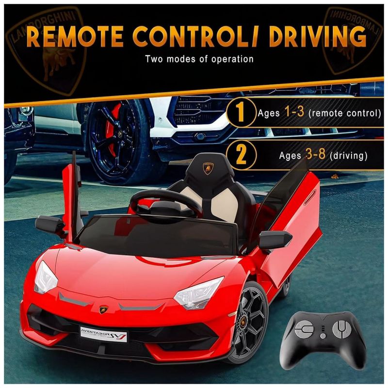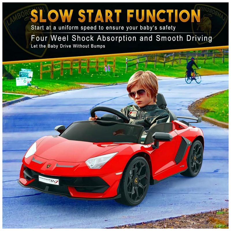 Este carro Rideon da Lamborghini é oficialmente licenciado e possui faróis de LED, sons de buzina e motor, além de portas hidráulicas que se abrem como o verdadeiro Lamborghini. Possui dois modos de condução: controle remoto dos pais e operação manual para crianças. Os pais podem ajudar a controlar este carro com controle remoto em três velocidades, caso a criança seja muito pequena. A criança pode operar o carro sozinha com o pedal e o volante em duas velocidades diferentes.