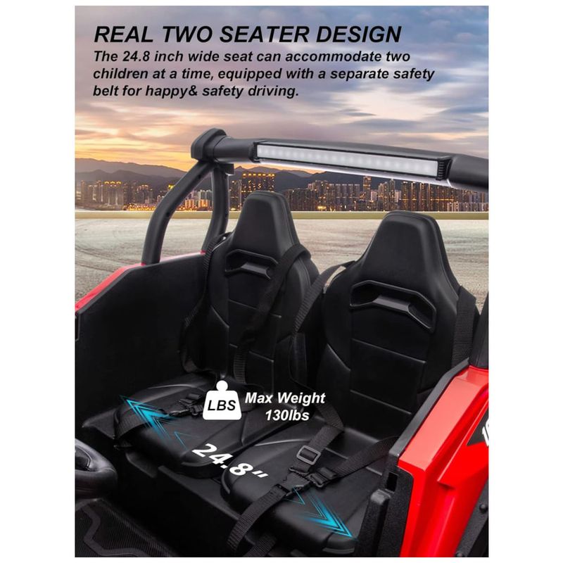 Este UTV de passeio para 2 lugares é a escolha perfeita para famílias que buscam diversão ao ar livre. Com espaço suficiente para um adulto e uma criança ou para duas crianças, o veículo vem equipado com 2 cintos de segurança para garantir a proteção durante a aventura.