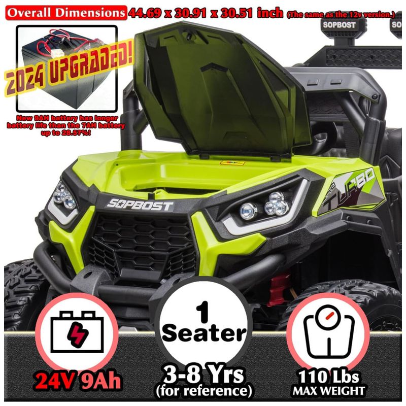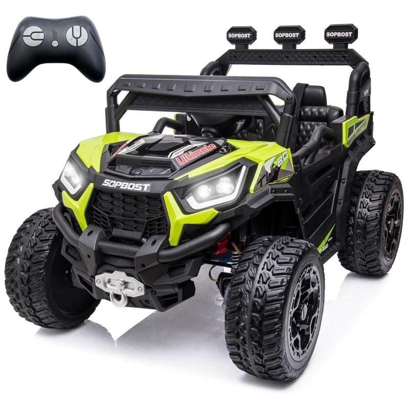 Durabilidade e Capacidade: Fabricado com um corpo de plástico PP durável e certificado pela ASTM F963, o UTV suporta uma carga máxima de 49,89 kg e alcança uma velocidade máxima de até 8 km/h. É um presente ideal para aniversários, Dia de Ação de Graças, Natal, Ano Novo e outras ocasiões especiais.