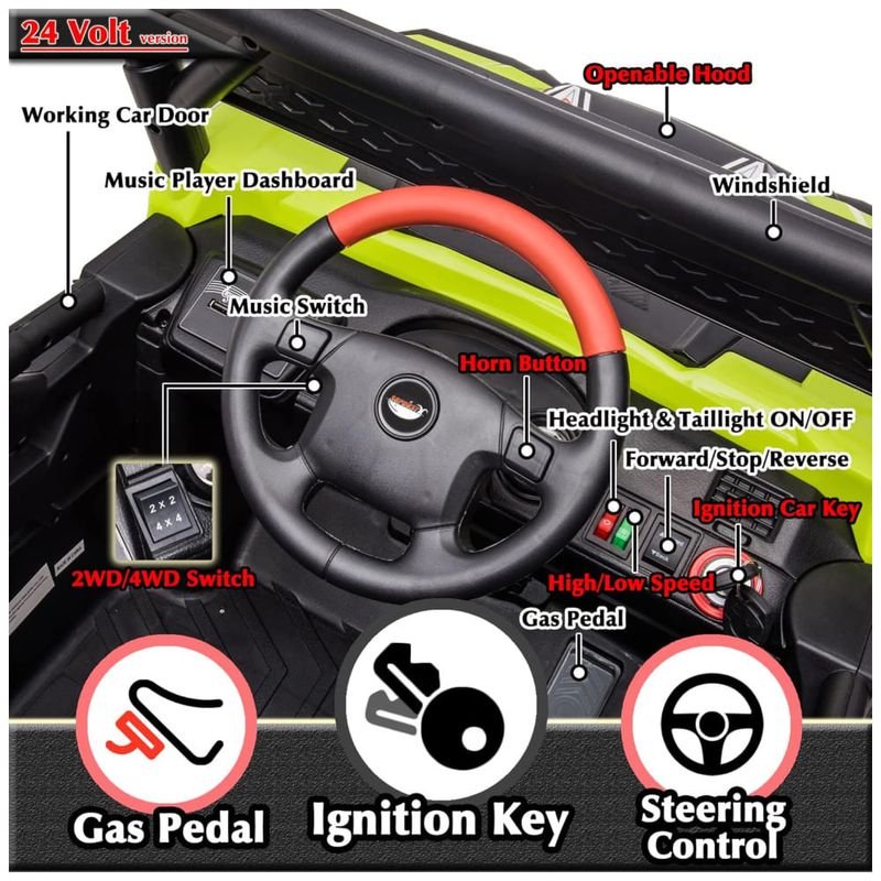 Design Realista e Aventura Off-Road: Com um design inspirado em UTV Off-Road, o carrinho possui partida com chave, cinto de segurança ajustável, luzes LED brilhantes e portas duplas com trava. A estrutura elevada e as rodas à prova de explosão e resistentes ao desgaste garantem um estilo off-road autêntico, permitindo que seus filhos explorem terrenos acidentados com segurança.