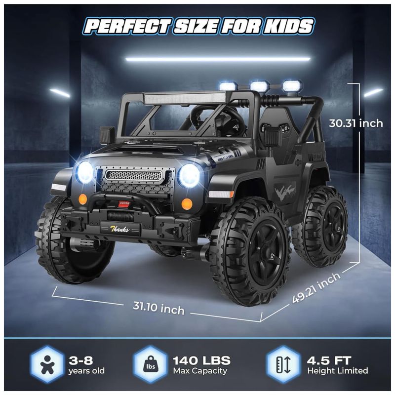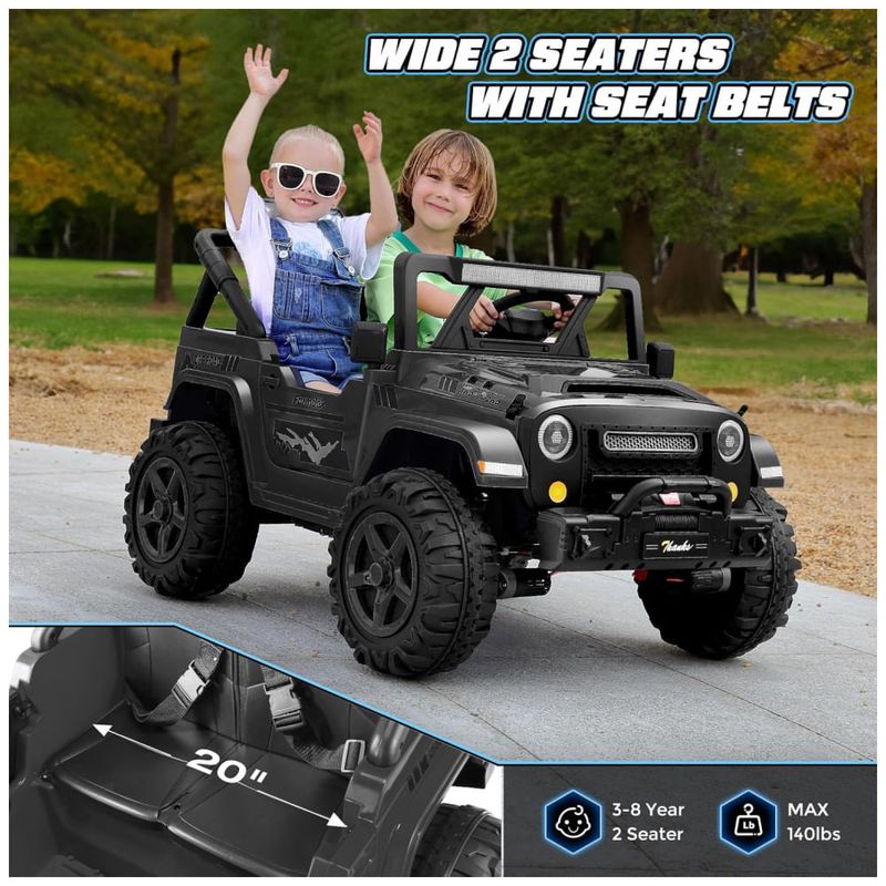 Com um design espaçoso de 43 cm de largura e dois assentos, o carro oferece espaço para duas crianças, garantindo diversão em dobro. Os recursos off-road incluem música integrada, MP3 player, portas USB, faróis LED, lanternas traseiras e luzes de LED sob o carro, proporcionando um visual vibrante e uma experiência de condução ainda mais emocionante.