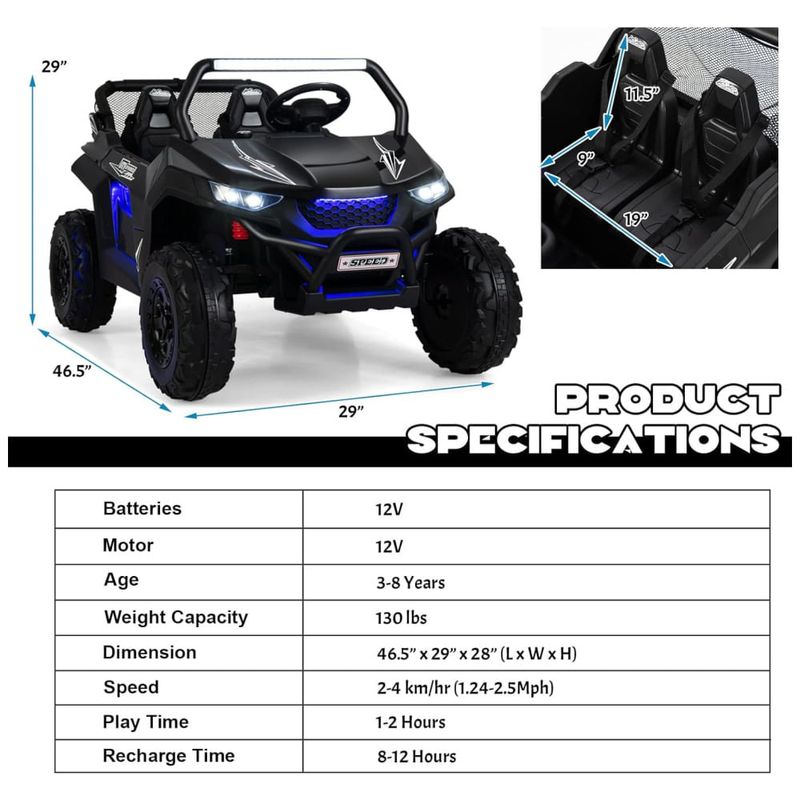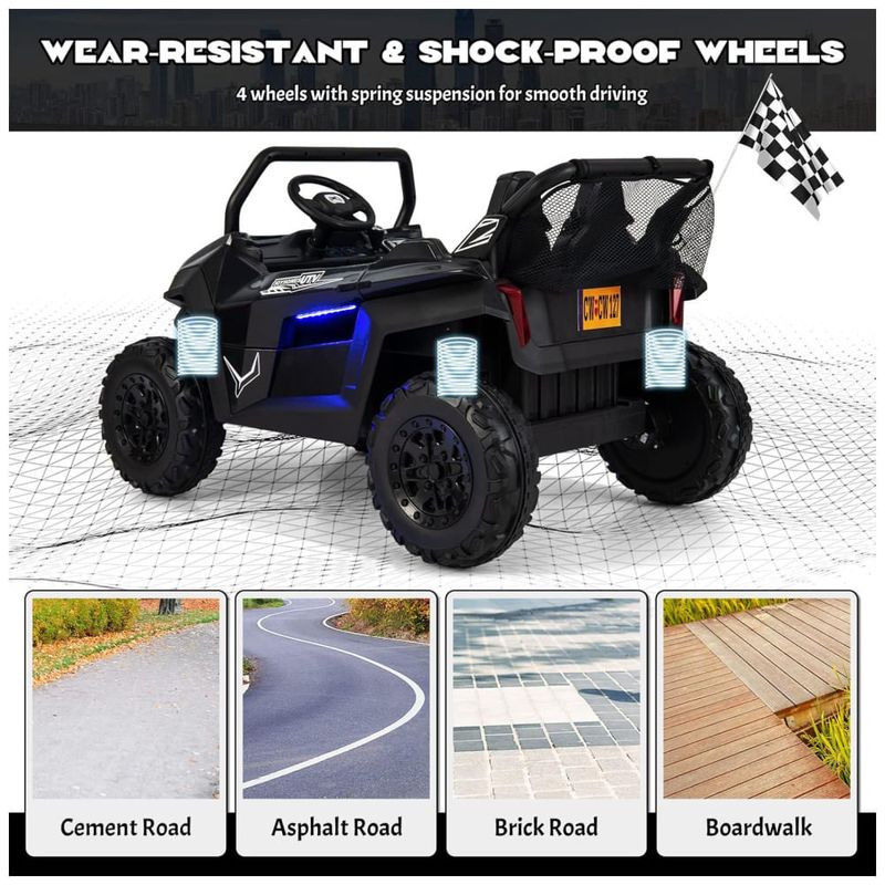 O UTV também inclui uma série de recursos de entretenimento, como música embutida, som real do motor e botões de buzina. Para tornar a condução ainda mais divertida, ele possui conectividade com USB, slot para MP3, FM e Bluetooth, permitindo que você toque as músicas favoritas das crianças durante a brincadeira.