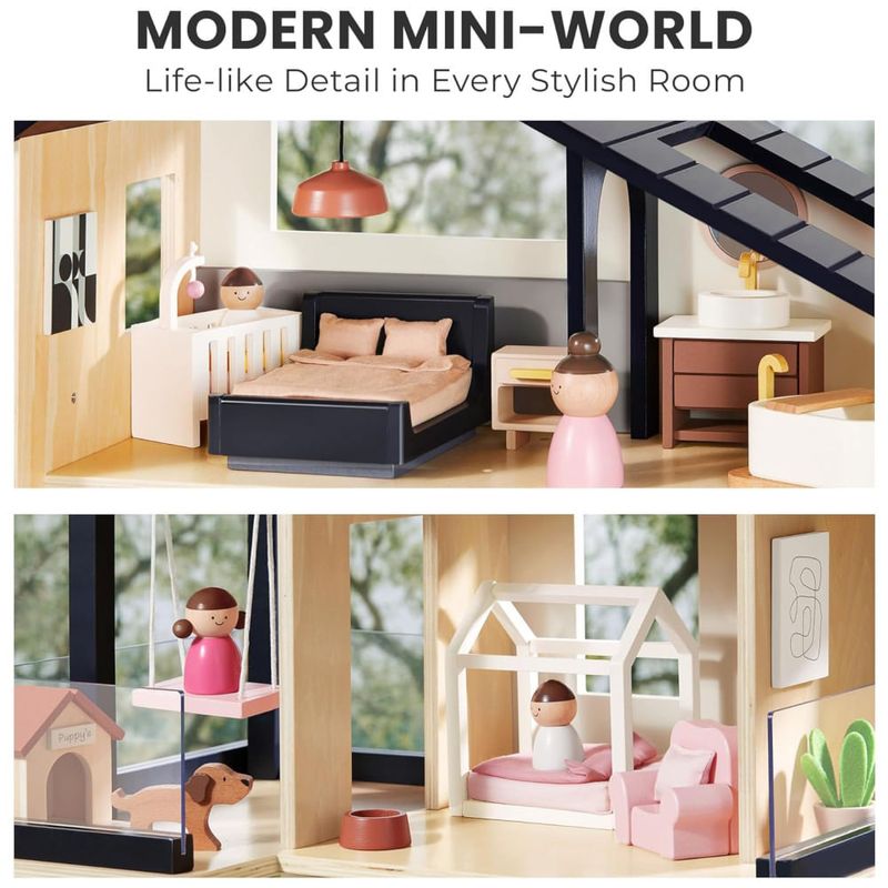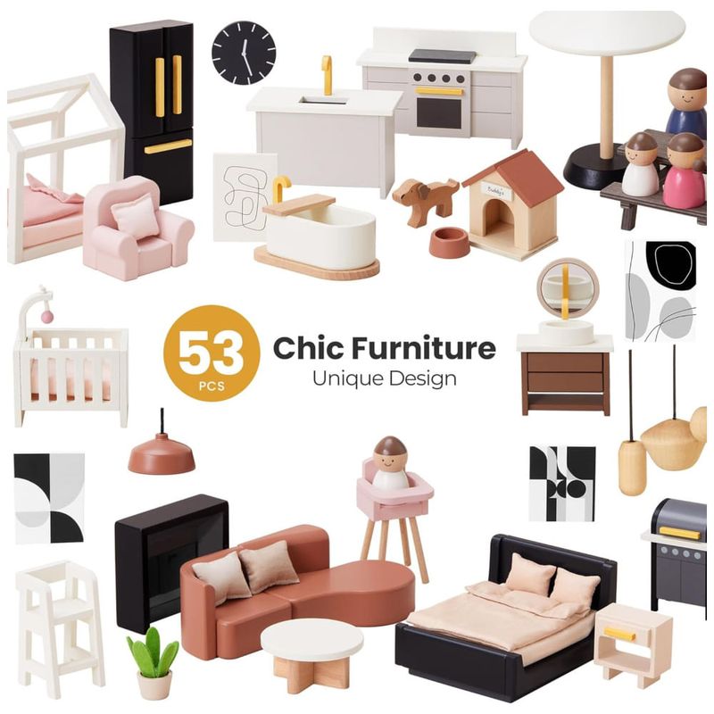Cada peça é trabalhada com cuidado, garantindo durabilidade e segurança. A casa de bonecas possui 7 quartos, incluindo sala de estar, quintal, quarto, banheiro, varanda, quarto das crianças e quarto dos pais, com móveis modernos correspondentes. Com um total de 53 peças de móveis, as crianças podem organizar e projetar quartos como quiserem. Projetado para crianças de todas as idades, promove brincadeiras cooperativas, tornando se uma experiência familiar saudável para irmãos, amigos e pais.
